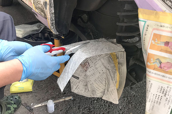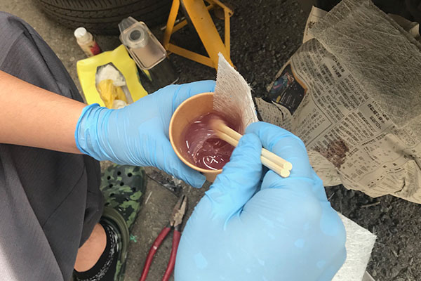 お知り合いの板金屋さんに相談したところ、さび転換材とさび止めスプレーを頂きました。さびは、今さびている部分からどんどん腐食が進んでいくため、まずはそこからさび止め処置を念入りにする必要があるそうです。以下手順で入念に処理します。