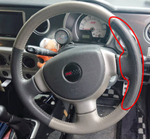 横から(ボスカバーみたいなのこれしか写ってなかった!この中にエアバッグ線とホーン線入ってます。割ときついのでしっかり固定しなくても、ガサガサとかなりません。)